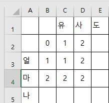 레벤슈타인 거리란 문자열의 유사도를 검사하는 기본적인 알고리즘으로 편집 거리라고도 부름 a문자열에서 b문자열로 편집할때 몇번의 조작이 필요한지를 도출해낸다 예를들어 '가나다라'와 '