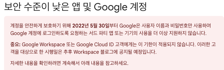 보내는 계정으로 구글을 썼는데 로그인을 못한다고 에러가 뜬다