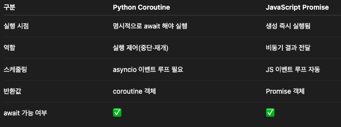coroutine: phthon 언어 차원에서 제공하는 제어 구조. 스스로 실행 x (비동기 함수의 실행 컨텍스트)