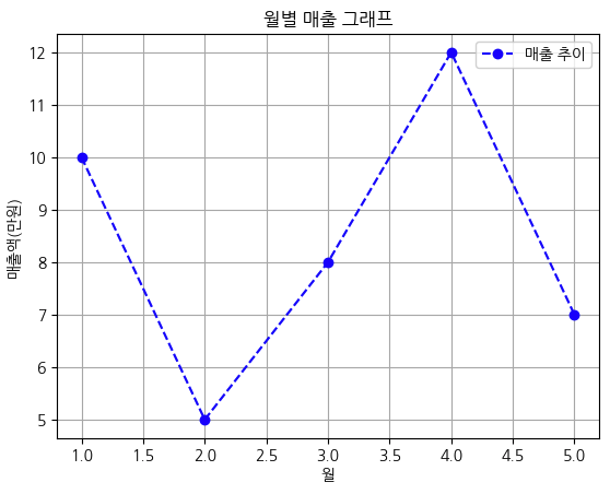 plt.plot(x, y, color='blue', marker='o', linestyle='--', label='매출 추이')