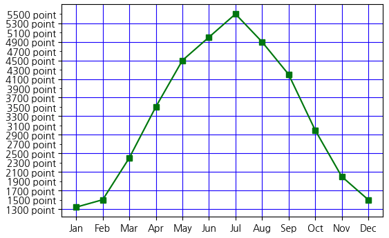 plt.axis(['Jul', 'Dec', 3000, 6000]) # x, y 축 한번에 설정