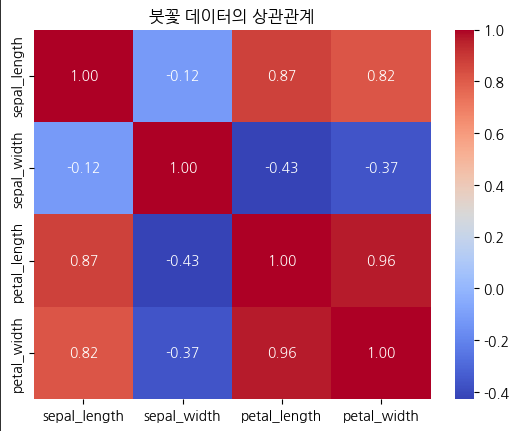 plt.title('붓꽃 데이터의 상관관계')