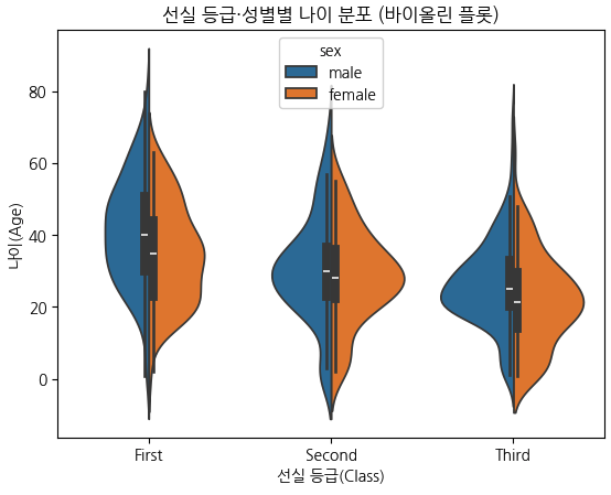 plt.title('선실 등급·성별별 나이 분포 (바이올린 플롯)')