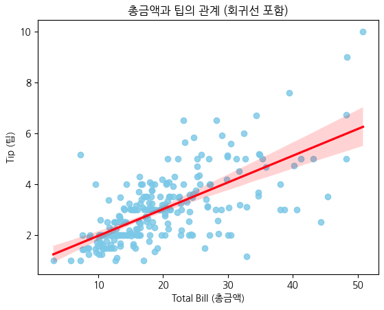 plt.title('총금액과 팁의 관계 (회귀선 포함)')