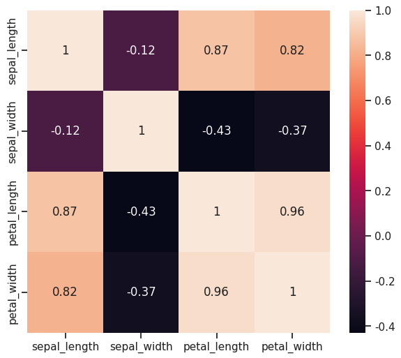 sns.heatmap(iris.iloc[:, 0:4].corr(),annot=True,)