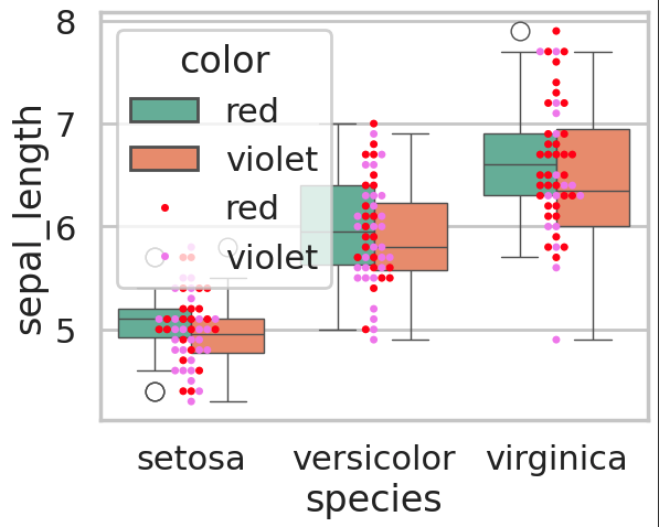 sns.boxplot(x='species', y='sepal_width', hue='color', data=iris, palette={'red':'red', 'violet':'violet'})