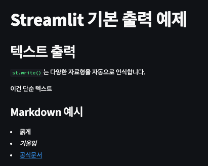 st.title("Streamlit 기본 출력 예제")