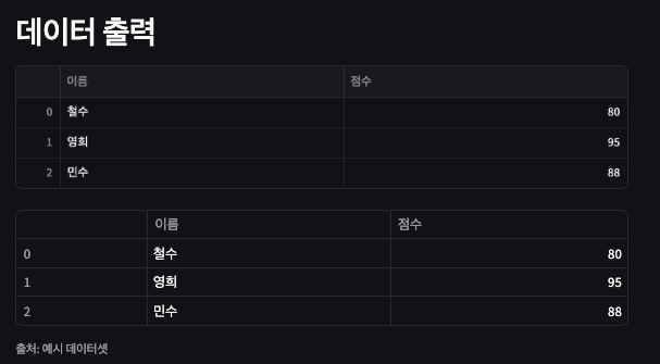 st.table({"이름": ["철수", "영희"], "점수": [80, 90]})