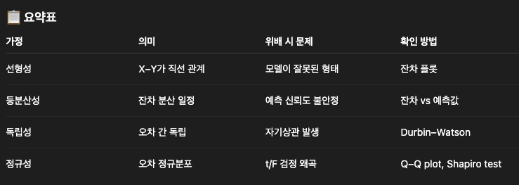 Q-Q 플롯이나 정규성 검정(예: Shapiro-Wilk 검정)을 통해 확인할수 있다 (Q-Q 플롯의 대각선 위로 잔차들이 위치해야 함)
