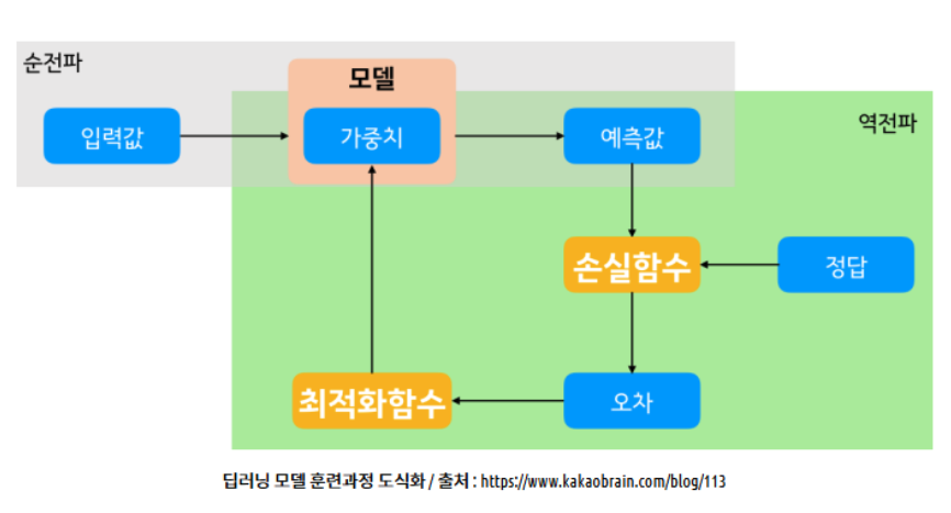 손실 → 오차 계산 → 가중치 조정