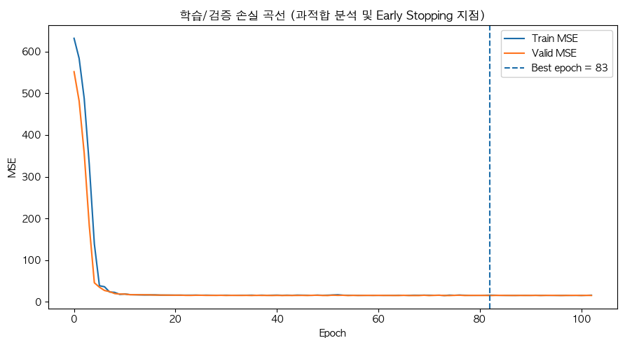 # • 손실 곡선: Best epoch 이후 Valid MSE 개선 정체/상승 → Early Stopping으로 과적합 구간 진입 전 종료.