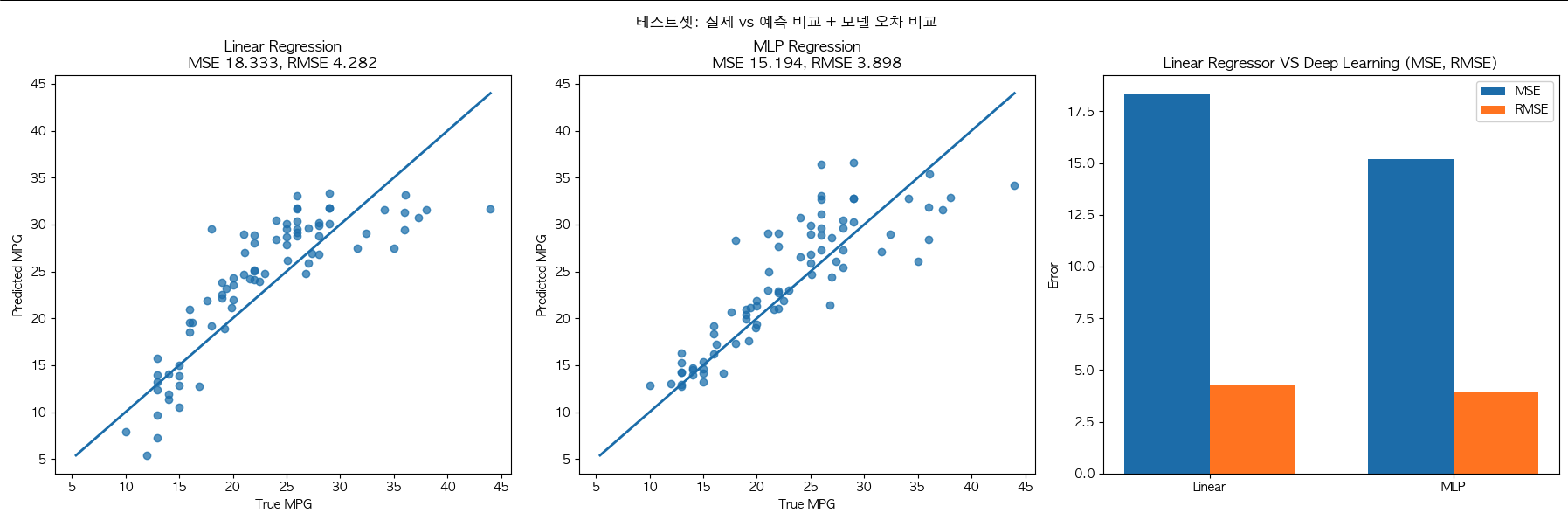 # • 모델 비교: 테스트 MSE/RMSE에서 MLP가 Linear보다 낮음 → 비선형 표현력이 이득.
