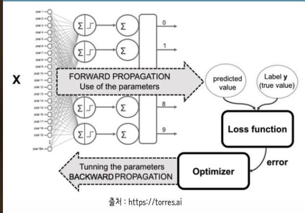 - 입력 X 가 네트워크를 통과하면서, 각 층의 가중치(weight) 와 활성화 함수(activation) 를 거쳐 예측값(predicted value) 을 계산한다.