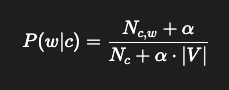 P(w∣c)=Nc,w+αNc+α⋅∣V∣P(w|c) = \frac{N_{c,w} + \alpha}{N_c + \alpha \cdot |V|}