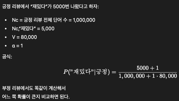 - α=1 (라플라스 스무딩) → 단어 등장 횟수에 모두 +1