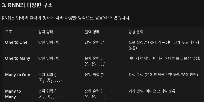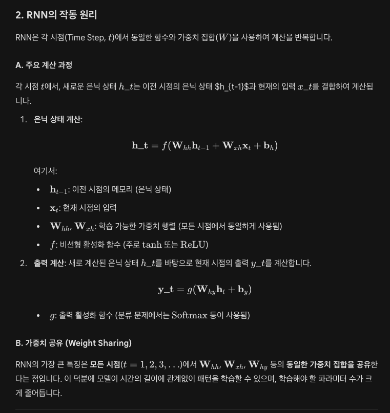 - 순환 구조: RNN의 은닉 계층에서 출력된 값이 다시 다음 시점의 입력으로 사용되는 구조를 가집니다.