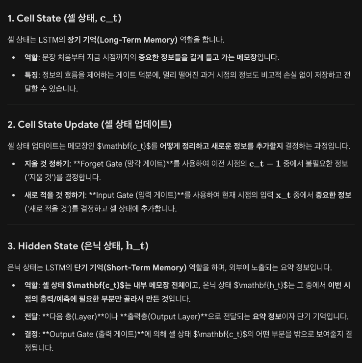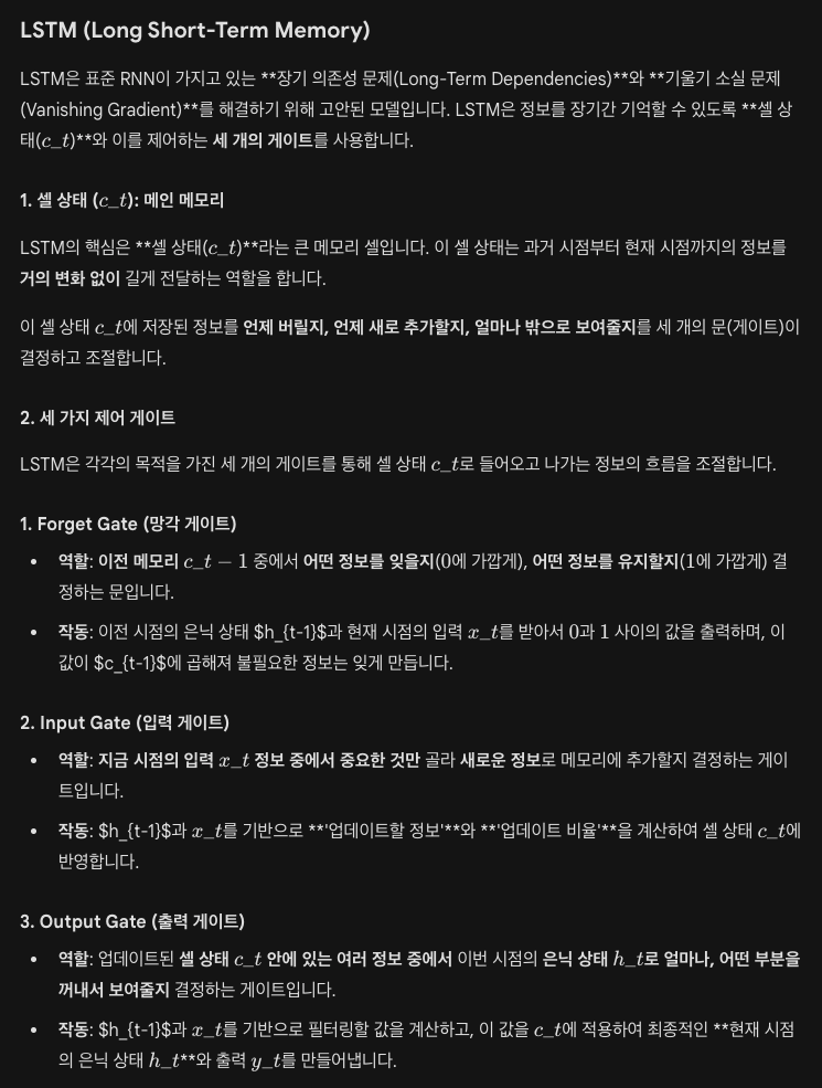 이러한 한계를 극복하기 위해 LSTM (Long Short-Term Memory) 및 **GRU (Gated Recurrent Unit)**와 같은 게이트(Gate) 구조를 가진 고급 RNN 모델이 개발되었습니다.