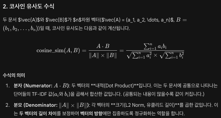 - 이때 코사인 유사도는 두 문서 벡터의 방향이 얼마나 일치하는지를 측정합니다.