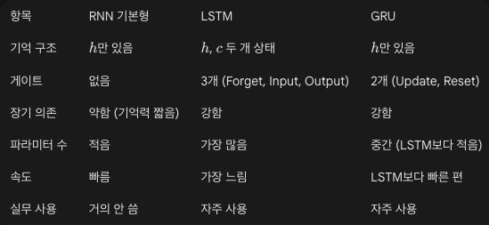 - 장점: LSTM보다 파라미터 수가 적어 계산이 빠르고 가볍지만, 성능은 비슷합니다. 실무에서 LSTM과 함께 자주 사용됩니다.