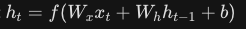 - 핵심 원리: 현재 시점의 입력 x_t와 직전 시점의 은닉 상태 h_{t-1}를 함께 사용하여 현재의 은닉 상태 h_t를 계산합니다. 이를 통해 이전 정보를 기억하며 다음 시점으로 넘어갑니다.