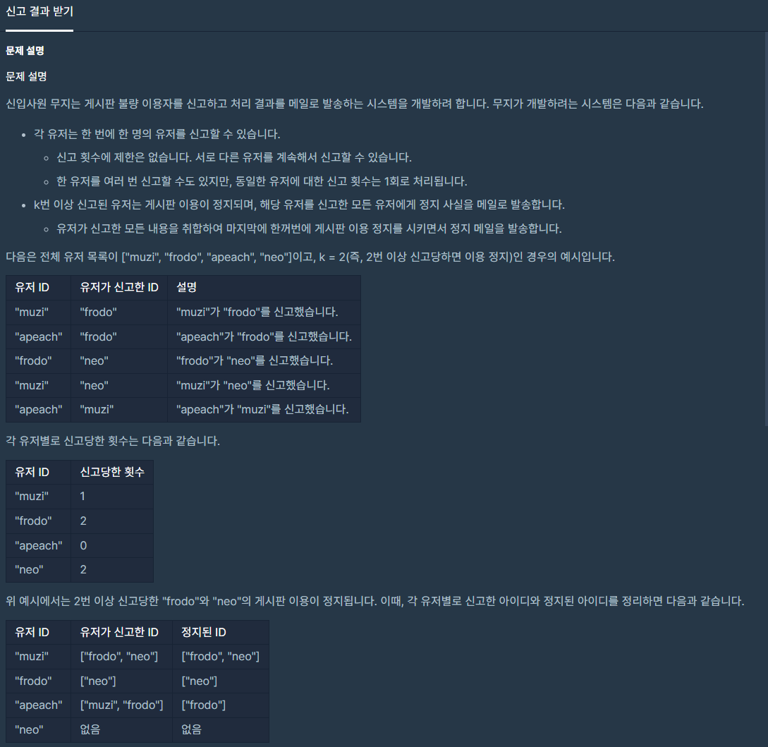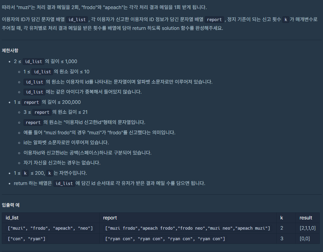 제제받는 사람을 키 값으로 가지고 있는 값들의 list인덱스를 직접 result의 인덱스에 매칭시켜서 ++해줬다