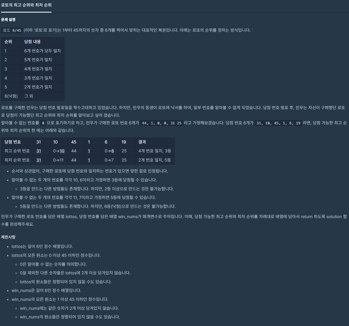 최대 당첨 갯수 = 최소 당첨 갯수 + lottos의 0의 갯수