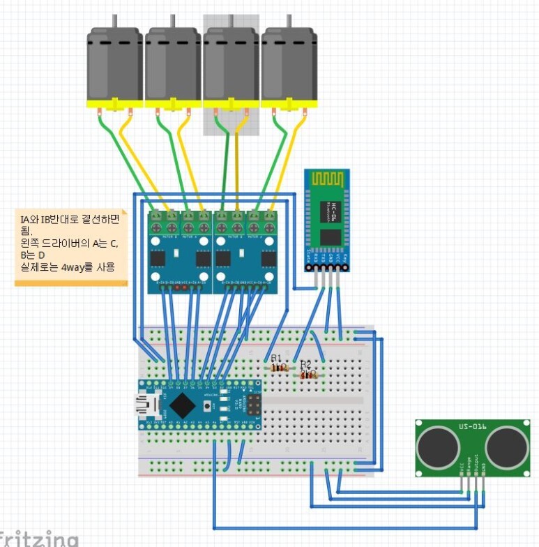 아두이노 나노 2개, 블루투스 모듈 (HC-06), 초음파 거리 센서 (US-016), 온도 센서 (LM-35), 사운드 센서 (HS-SOUNDSM-II), 와이파이 모듈 (ESP8266), DC모터, 모터 드라이버(L9110S-4WAY)