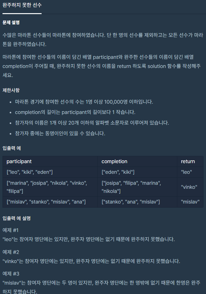 두 배열을 오름차순을 한후에 같은 index를 비교하다가 다르다면 그 사람이 완주 못한 선수