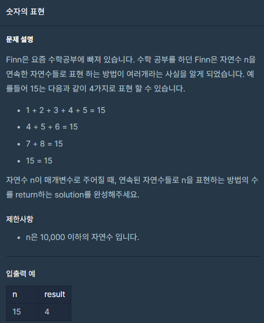 자연수 n을 연속한 자연수의 합으로 표현할 수 있는 개수는 n의 약수중 홀수의 개수와 같다