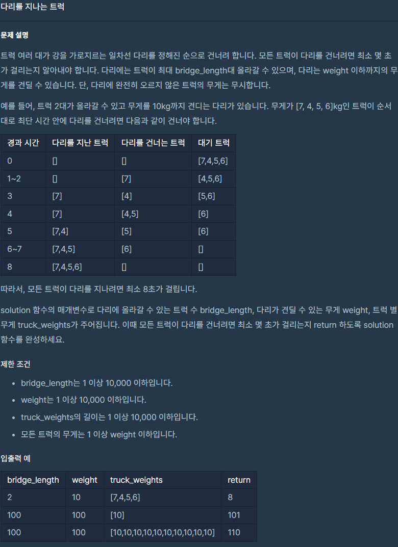 // 2. 다리 위 트럭 무게 합 + 대기중인 트럭의 첫 무게가 감당 무게 이하면