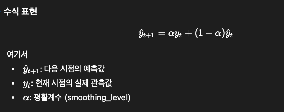 - 최근 관측값일수록 더 큰 가중치(α, 알파)를 주어 평균 수준(level) 을 추정하는 방식이다.