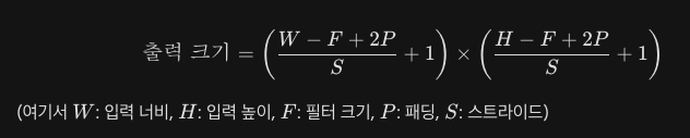 - 연산: 필터가 입력 이미지 위를 일정한 스트라이드(Stride) 간격으로 이동하면서, 필터가 겹치는 이미지 영역과 필터의 원소를 원소별로 곱한 후 모두 더하는 연산을 수행합니다.